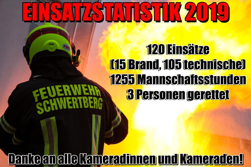 Im Jahr 2019 wurde die Feuerwehr Schwertberg zu 120 Einsätzen gerufen, diese teilen sich in 15 Brand und 105 technische Einsätze auf. In insgesamt 1255 Mannschaftsstunden wurden diese abgearbeitet und dabei 1082 Kilometer Unfallfrei mit den Einsatzfahrzeugen zurückgelegt. Insgesamt konnten 3 Personen aus einer Notlage befreit und gerettet werden. 35 Mal wurde mittels Sirene alarmiert, zu den restlichen wurden die Feuerwehrmitglieder mittels „Stiller Alarmierung“ verständigt.
