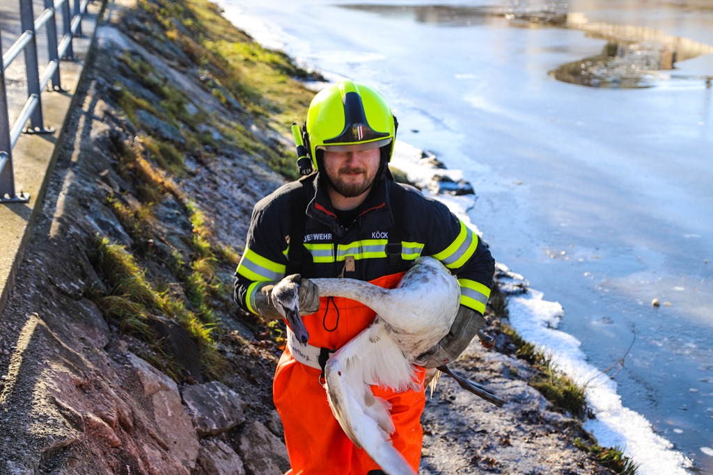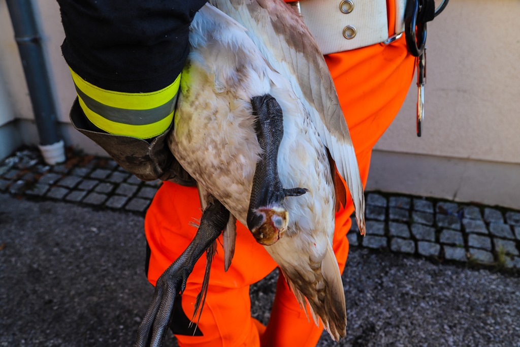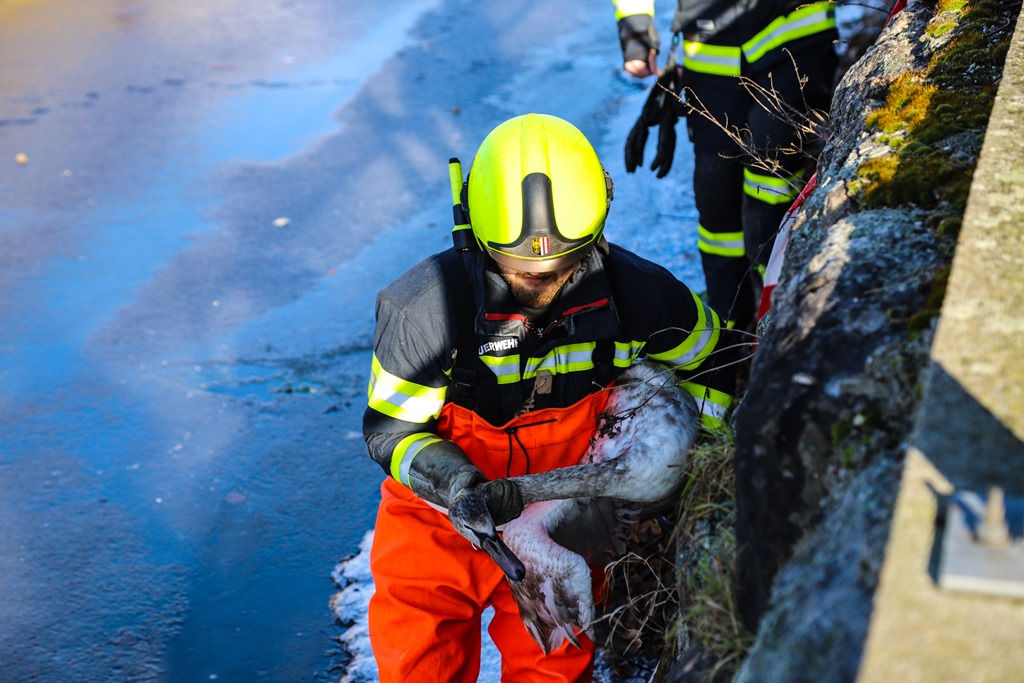 Die ausgerückten Kameraden konnten einen sichtlich erschöpften und vor allem schwer verletzten Schwan, welchen ein Teil des linken Fußes fehlte, vorfinden. Ein Feuerwehrmann rüstete sich daraufhin mit einer „Wathose“ und einem großen Kescher aus um das Tier möglichst schonend zu fangen. Dies gelang relativ rasch und das Tier konnte daraufhin zu Fuß in das nahegelegene Feuerwehrhaus getragen werden. Dort wurde das Tier in einem abgedunkelten Raum bis zum Eintreffen der Tierrettung versorgt und anschließend übergeben.