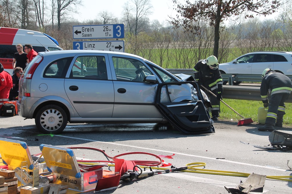 Gemeinsam mit den Feuerwehren Aisting-Furth, Perg und Haid wurden wir um 11:36 Uhr zu einem Verkehrsunfall auf der B3 höhe KCS alarmiert. Im Bereich der Kreuzung kollidierten aus noch ungeklärter Ursache zwei PKW. Durch die Wucht des Aufpralles wurde eine Person im Fahrzeug eingeklemmt. Die Person konnte gemeinsam mit den anwesenden Feuerwehren und dem Großaufgebot vom Roten Kreuz rasch befreit werden. Die Aufräumarbeiten wurden von der zuständigen Feuerwehr Aisting-Furth übernommen und somit konnten wir um 12:30 Uhr den Einsatz beenden.